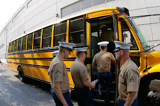 On Monday 28-May I met Mr. Croft at Bogota High School and boarded the school bus, with Nick Zampetti for the trip into New York. We arrived at pier 92 and waited to met the personnel that would be coming. The first were the Marines from Charlie Company 1st Battalion 9th Marines. There was a bit of a wait for the next group to arrive so those who did not want to sit on a hot bus stayed outside, chatted ,or texted, on their phones, and talked among themselves. We were told we had to wait for Sailors from USS Roosevelt to be cleared in order leave their ship. When the next group arrive they were not the personnel that was expected. A detachment from one of the collation force would join the group going to Bogota. These were 4th year Cadets from the Spanish Navy who have been training on the four-masted schooner Juan Sebastian De Elcano. They and the Sailors from USS Roosevelt all proceeded onto the bus and headed to New Jersey. It was a quiet ride out of New York, some getting a little more sleep, and others just looking out the windows.