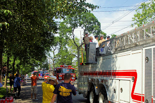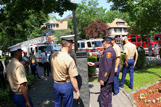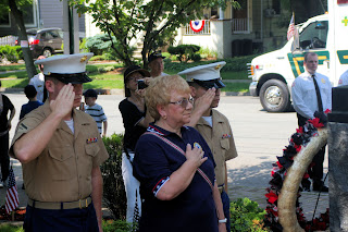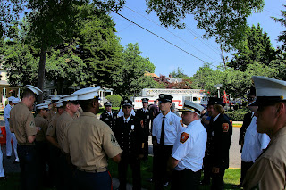 The Bogota Fire Dept. held their remembrance ceremony first around the monuments in Borough Hall park. The Marines started to ask, at the same time the Fire Fighters offered for them to join them in their service. All bowed their heads as Father Supple said a prayer to those members who have pass. Then a group photo took place around the POW/MIA Memorial. Then the ceremonies by the American Legion /VFW took place. The service men placed themselves with the towns people sharing the moment together in remembering those who have come before. During the service a wreath was placed at the POW/MIA monument by Kathy Fry. Ms.Fry was escorted by Marines Kevin Brakhage and Donald Brackin II. The final part of the morning was with Mr. Croft thanking all who came to the ceremony, and also thank the Men, and Women who are currently serving, for their time to join in a small town's remembrance for those who have left. With that the audience cave the visitors to Bogota a round of applause for all they do. After the ceremony they went to the VFW hall for a lunch. There Bogota Blog NJ was able to sit and talk to a few of them on their thoughts of what they do, and what they think of a day in New Jersey.
