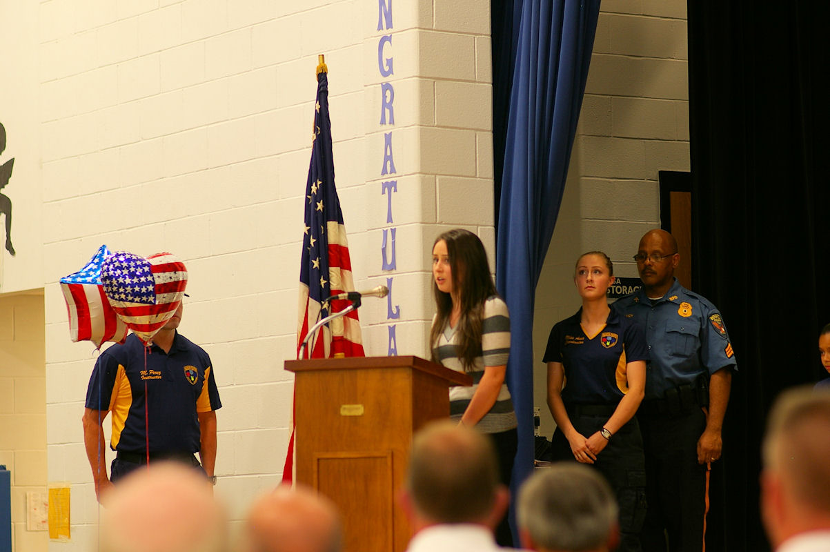 After a performance of the National Anthem by Katie Ferris. Sgt. Lynch began the program by thanking the parents of the Cadet for allowing them to take part in the Academy. He told the parents that was his honour, & pleasure the he was entrusted with their children. He introduced his staff who helped instruct and motivated the Cadet. Police Chief Burke was asked to speak to the audience about his idea for the Academy. Chief Burke in-turn thanked Sgt Lynch and Program Coordinator Anna Ferris(with a broken toe not stopping her from sharing this event with the Cadets) in growing the Academy idea in two short years into the stellar program that is has become.