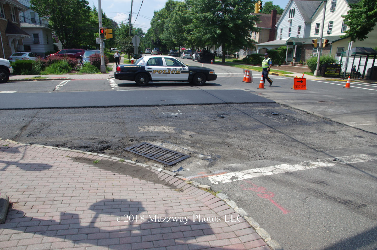 Around 3:00p on Monday-16-July W. Main St from Elm Ave and Larch Ave was reopened to traffic. Crews contracted by Bergen Country finished the repaving of the eastbound lane of W.Main St. This was the section of the street that was excavated by Suez water in order to replace an outdated water main. The westbound lane, along with sections that extended across both lanes were to be be repaved. The eastbound lane will need to be repaved at a later date, The patterned crosswalks at both ends of W.Main St will need to be restored by the Bogota Dept. of Public Works if needed. This is the final part of Suez Water's responsibility for their work that was started in November of 2017. At that time a new water was installed to replace the older, and smaller line. Bergen County needed to wait until all the excavation work had stabilized be fore repaving could begin. Work started at 7:00a by milling and removal of the old asphalt. Crews then repaved, and smoothed the road surface. Some time was given to allow the new material to harden with W.Main opening to regular traffic ahead of schedule.